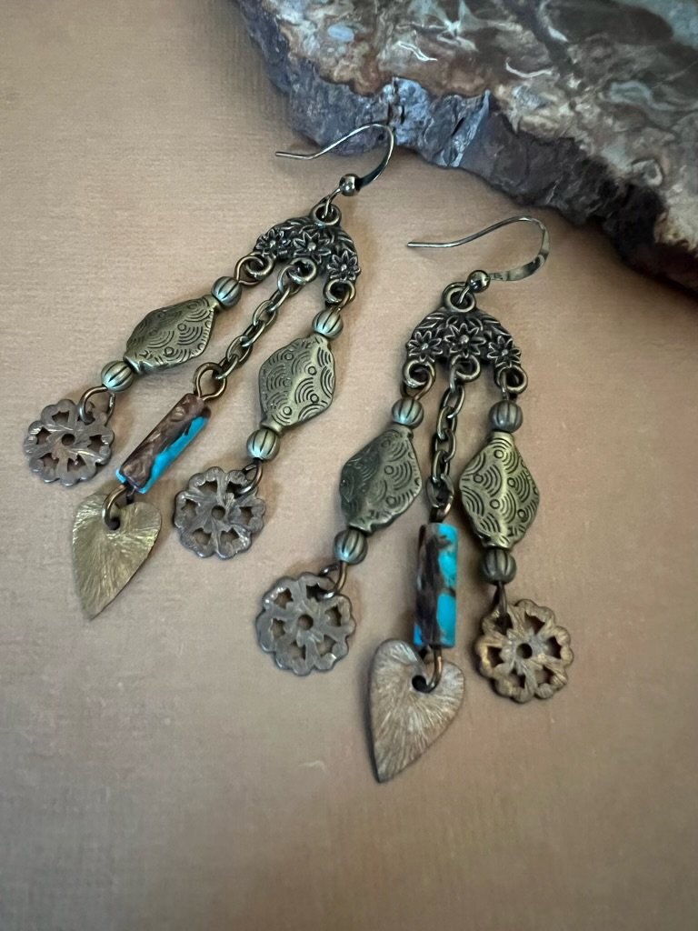 Boho Style Coral, Imperial Jasper, and Brass Earrings on Antiqued Brass Earwires: These earrings embody boho style and bohemian charm. Coral, Imperial Jasper, and brass elements come together on antiqued brass earwires, creating a bohemian masterpiece for your ears.